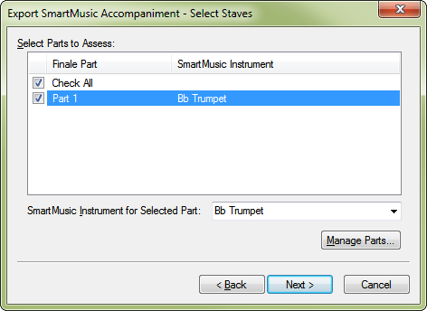 Use the drop-down menu to make sure the Finale Part is assigned to the appropriate SmartMusic instrument. Finale draws information for SmartMusic Accompaniments from the linked part definition. To change the properties of a part, such as the name or staff assignment, click the Manage Parts button. See Manage Parts dialog box.